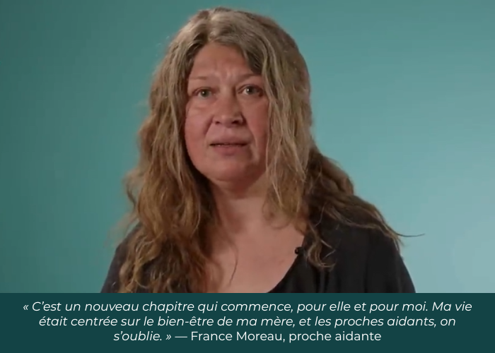 Lorsque son père est décédé, France Moreau a dû prendre soin de sa mère atteinte d’Alzheimer. Peu à peu, les gestes du quotidien sont devenus trop lourds : habiller, laver, nourrir… jusqu’à devoir prendre la douloureuse décision de quitter la maison familiale. France raconte les nuits sans sommeil, l’angoisse du jour du départ, mais aussi le soulagement inattendu : sa mère, entourée et stimulée dans son nouveau milieu, a retrouvé une forme de joie, tandis qu’elle-même pouvait redevenir « la fille » de sa mère, plutôt que son aidante à temps plein. Elle partage, en compagnie de Mme Mulcair des stratégies pour mieux vivre le déménagement.